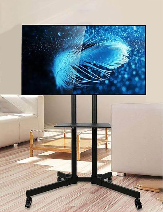 - Facile à déplacer : Ce chariot TV mobile est équipé de 4 roulettes 360°. Les roulettes avant avec freins permettent de fixer ou de déplacer le chariot du meuble TV en cas de besoin pour changer l’angle de vue du téléviseur, et il est également facil